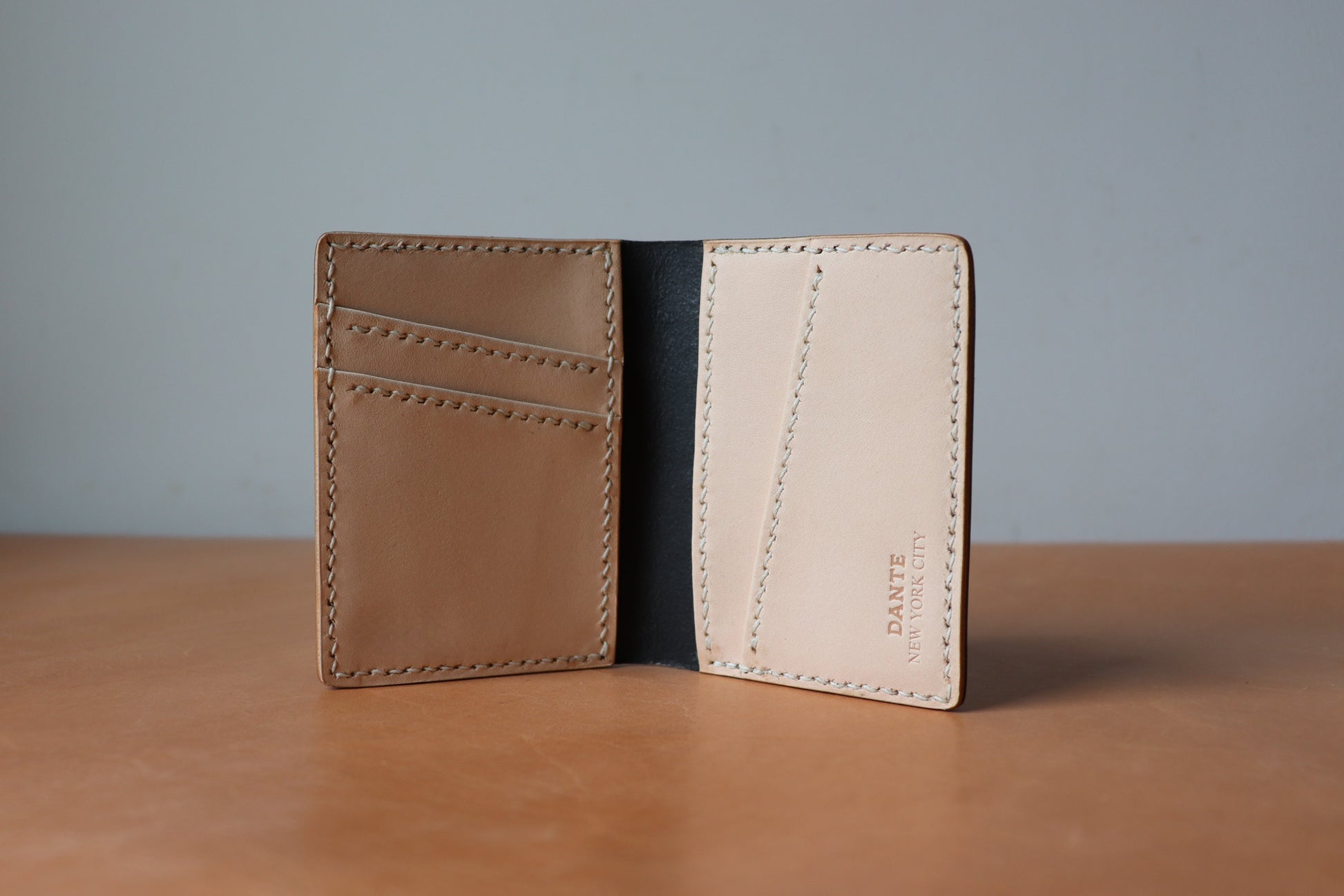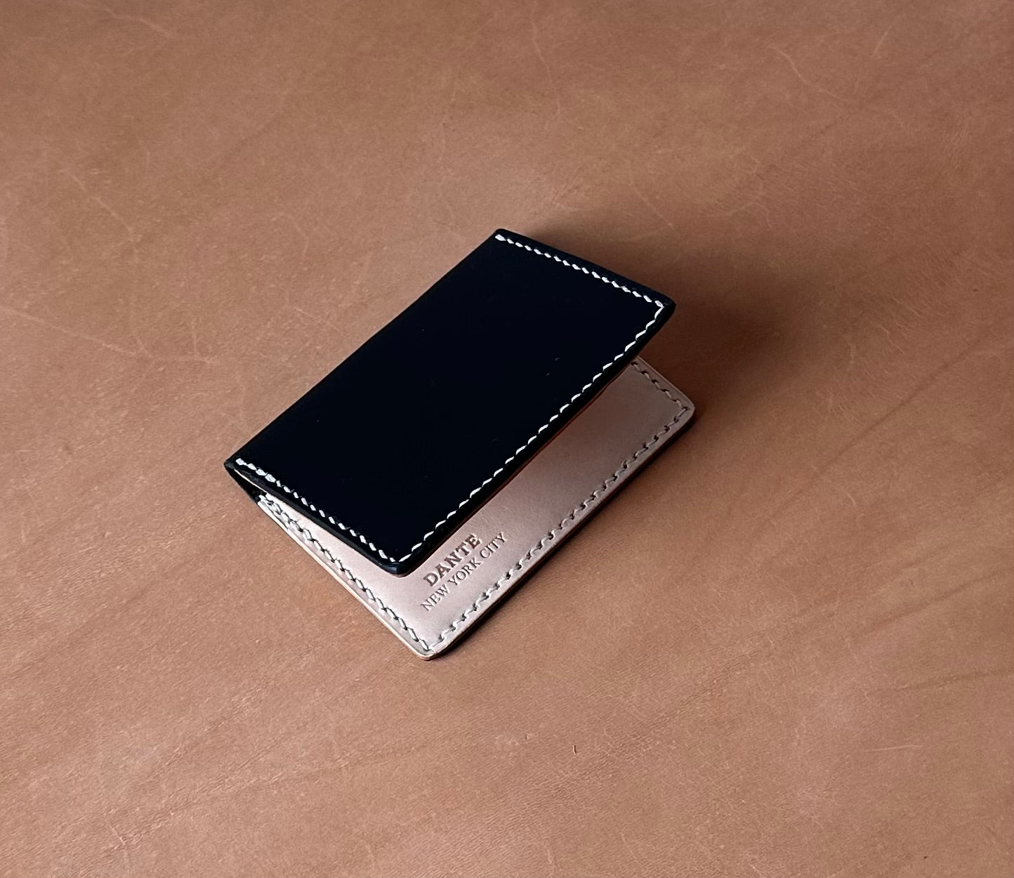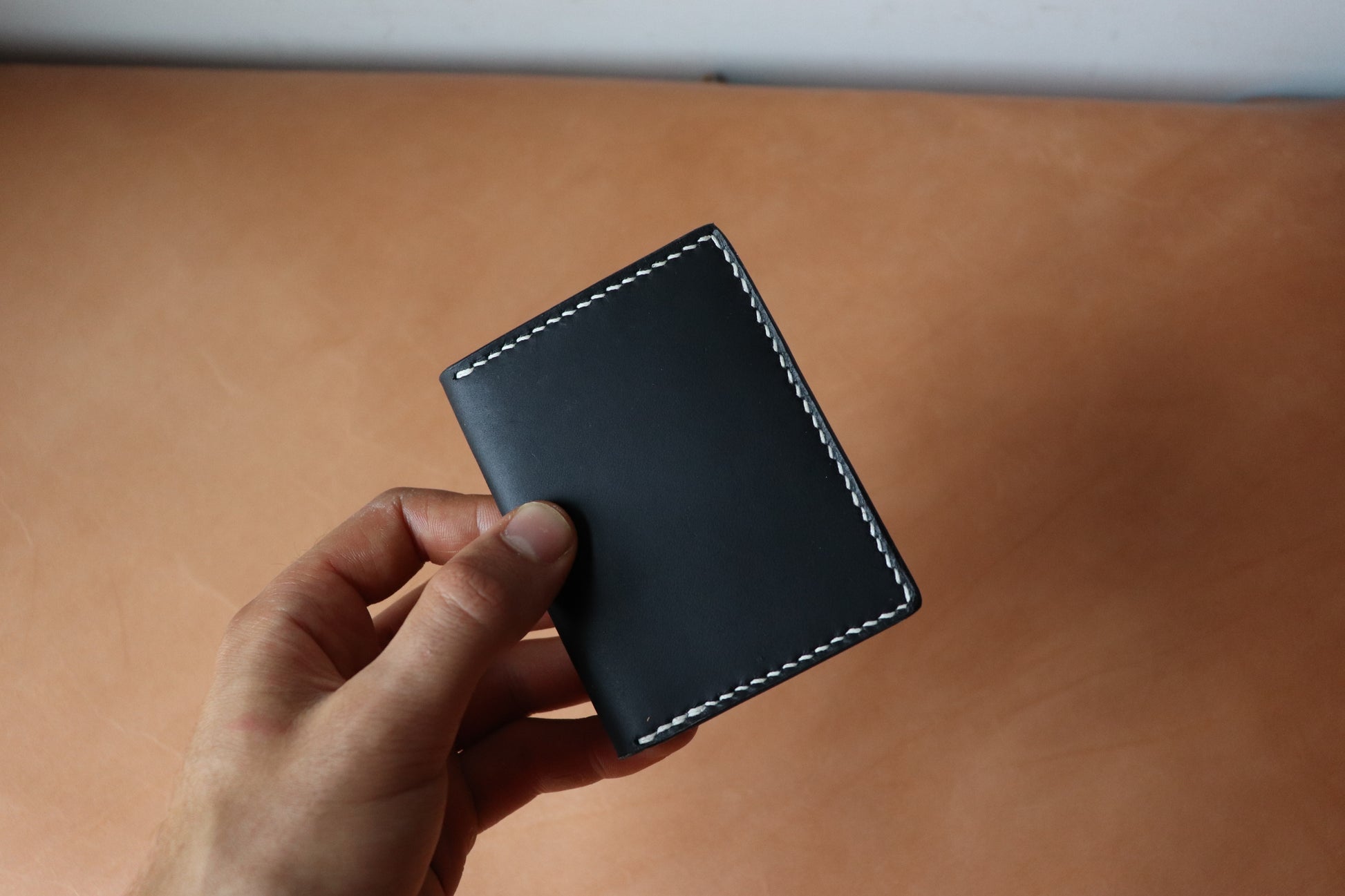 Beautiful, handcrafted mini bifold wallet in black and natural vachetta leather