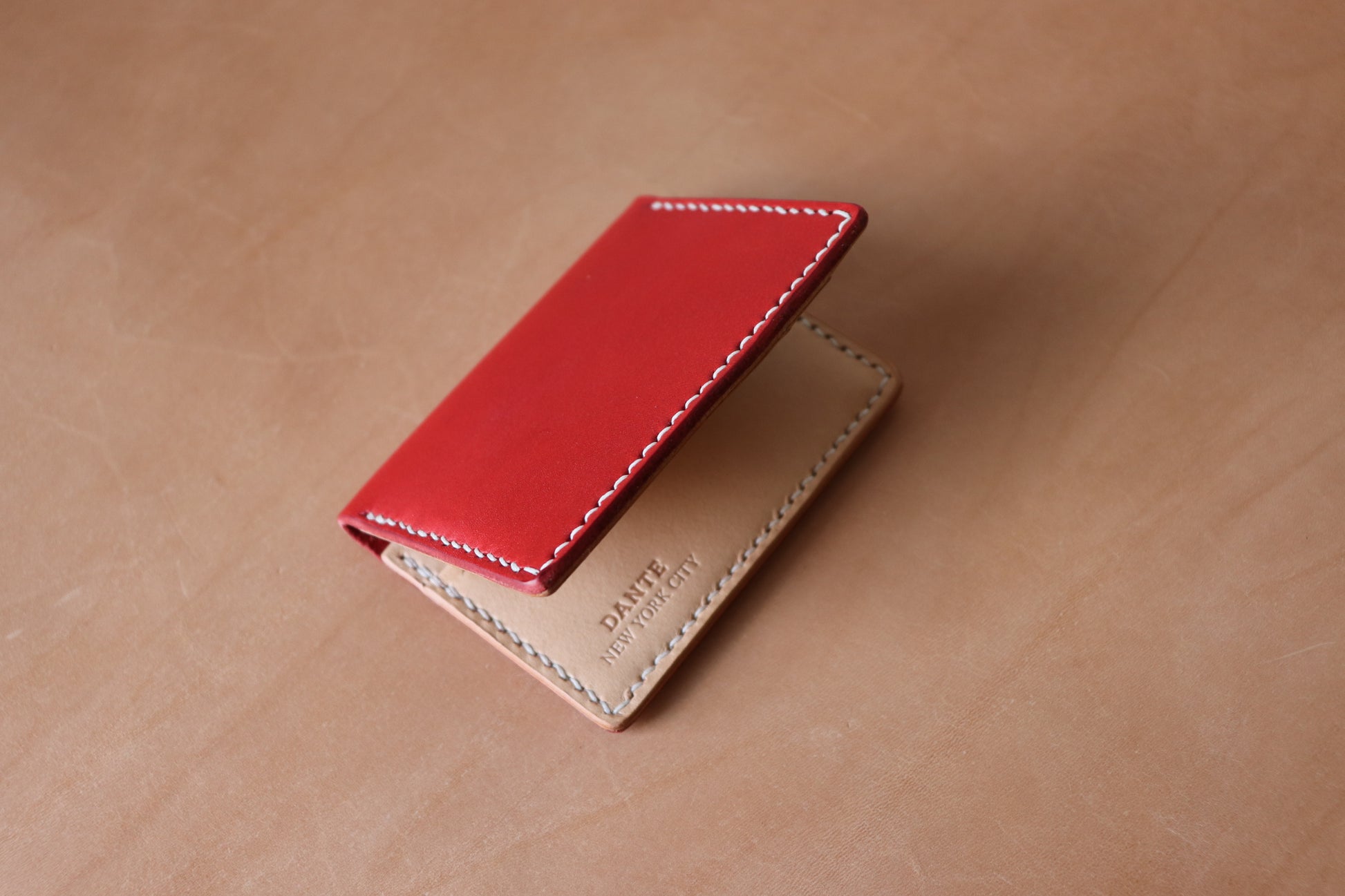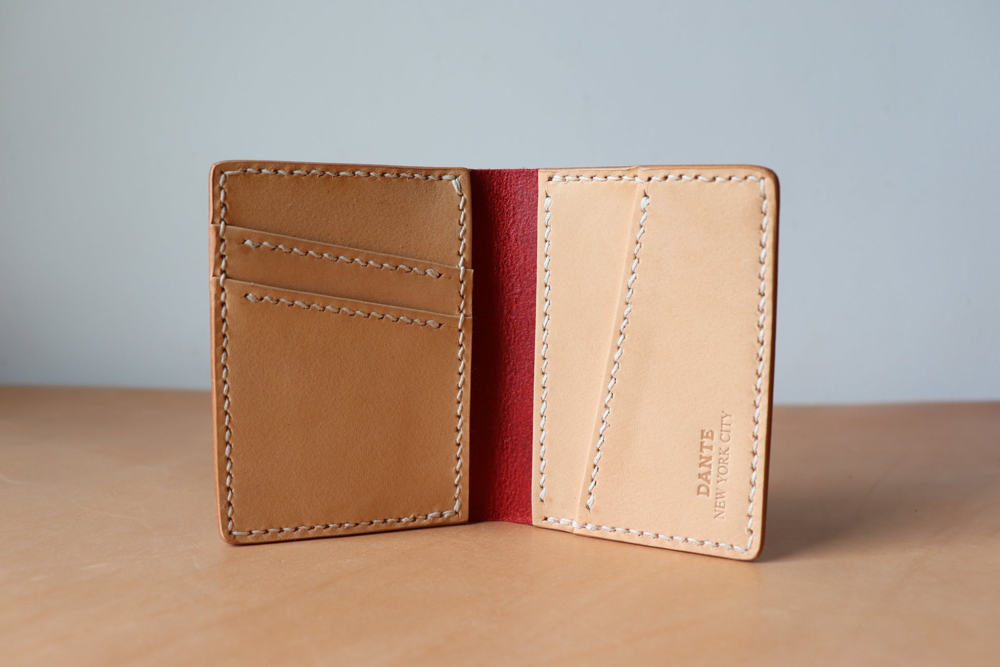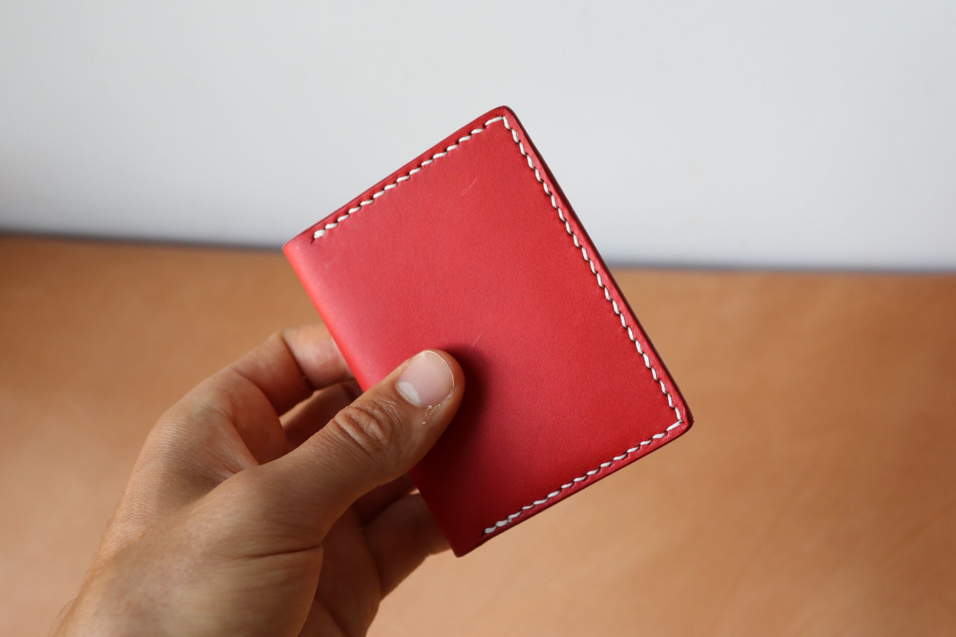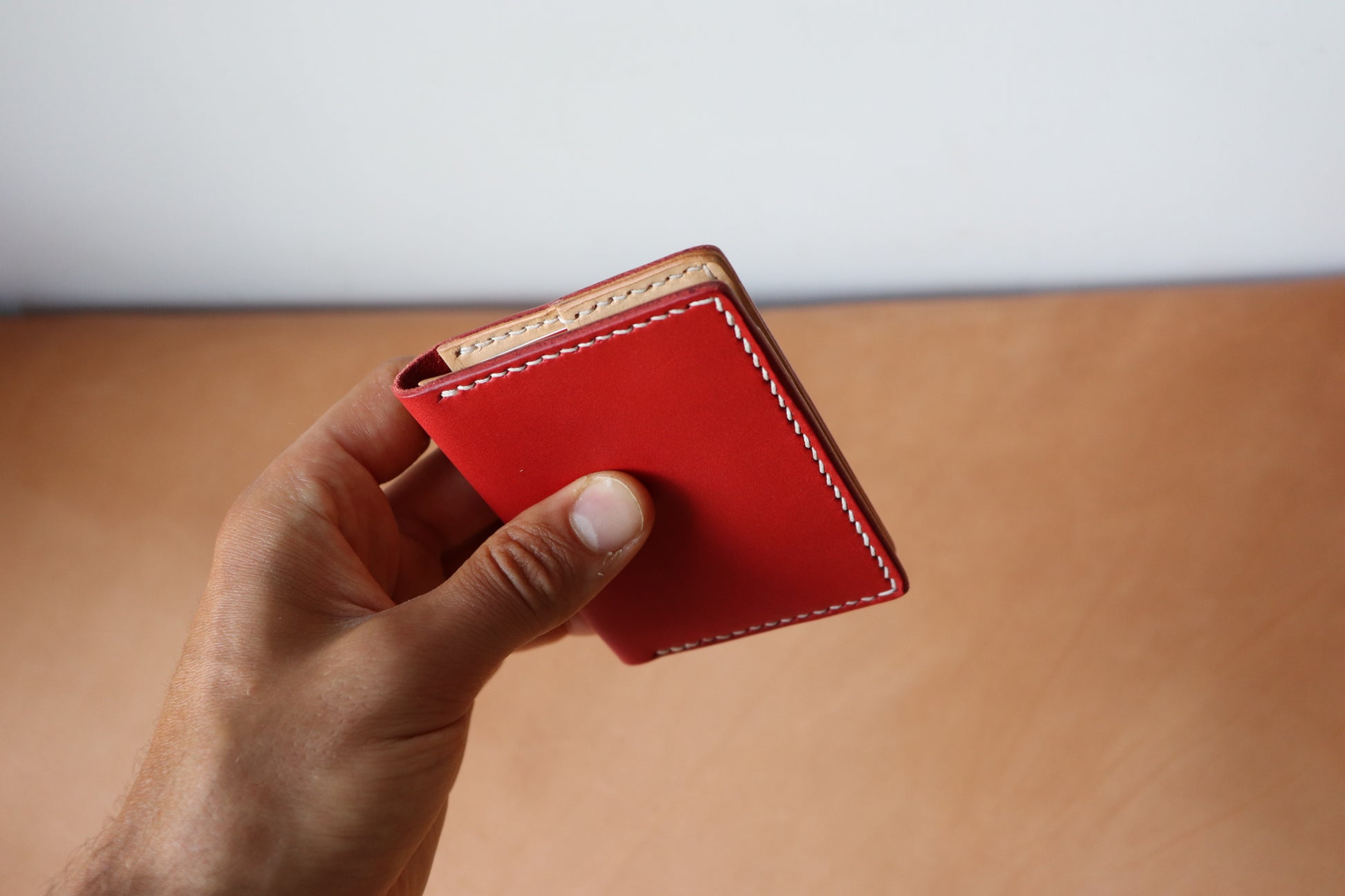 Beautiful, handcrafted mini bifold wallet in red and natural vachetta leather